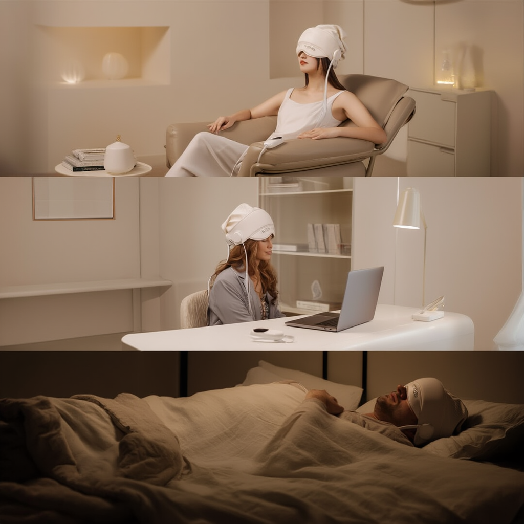Stop the throb of migraines and screen fatigue instantly. Our 360° neural wrap combines deep air-pulsation with a 42°C constant-heat compress to reset your nervous system for deep sleep